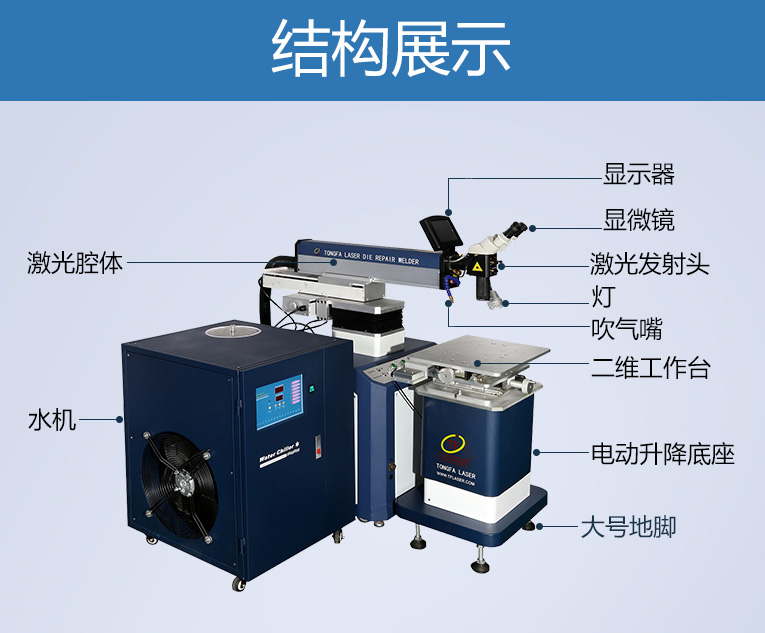 出口型模具激光焊機是通發(fā)激光公司專門為出口國外客戶使用而設(shè)計的系列機型TFL-200E,適用于各類精密注塑模具、壓鑄模具等模具激光修補焊接;同時也適合鑄件沙孔激光修補、模具崩缺激光修復(fù)、過切加工等的激光修補;各類金屬結(jié)構(gòu)件、金銀首飾的激光焊接加工。